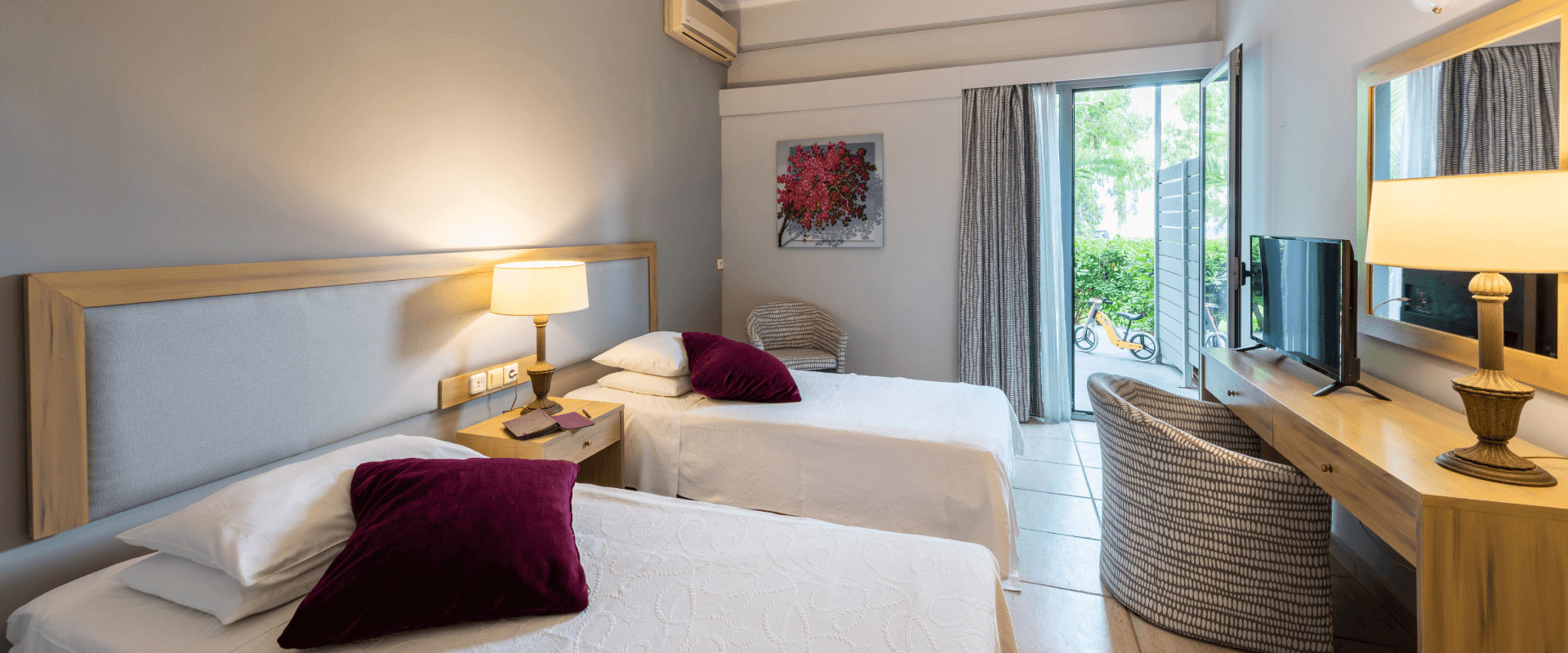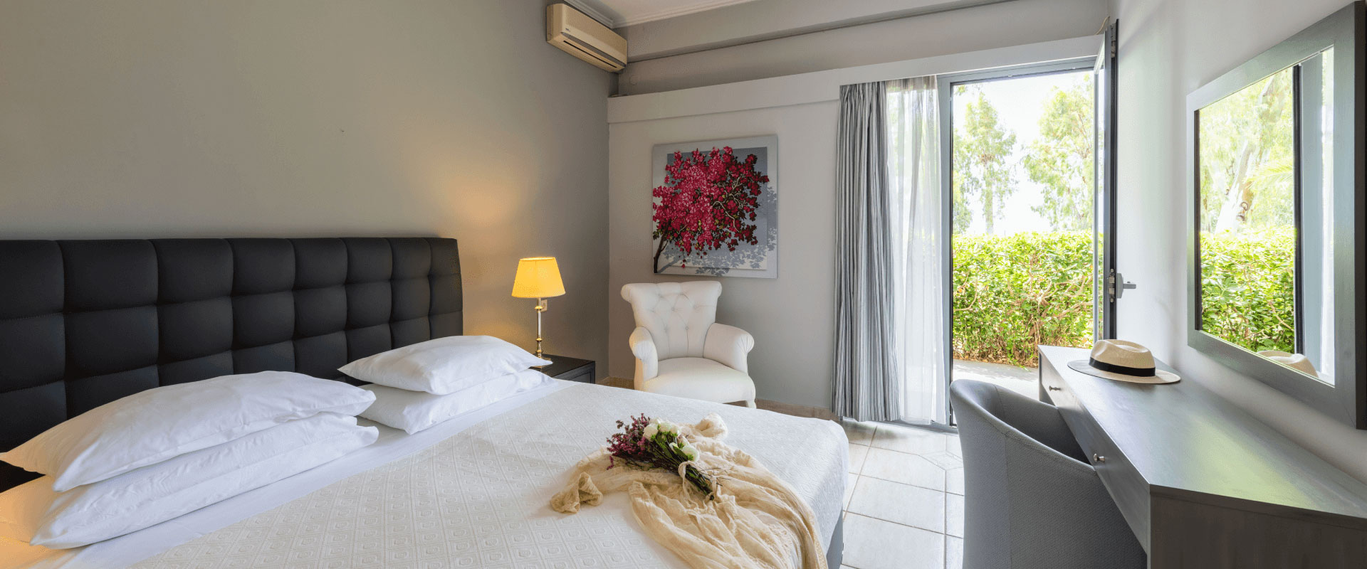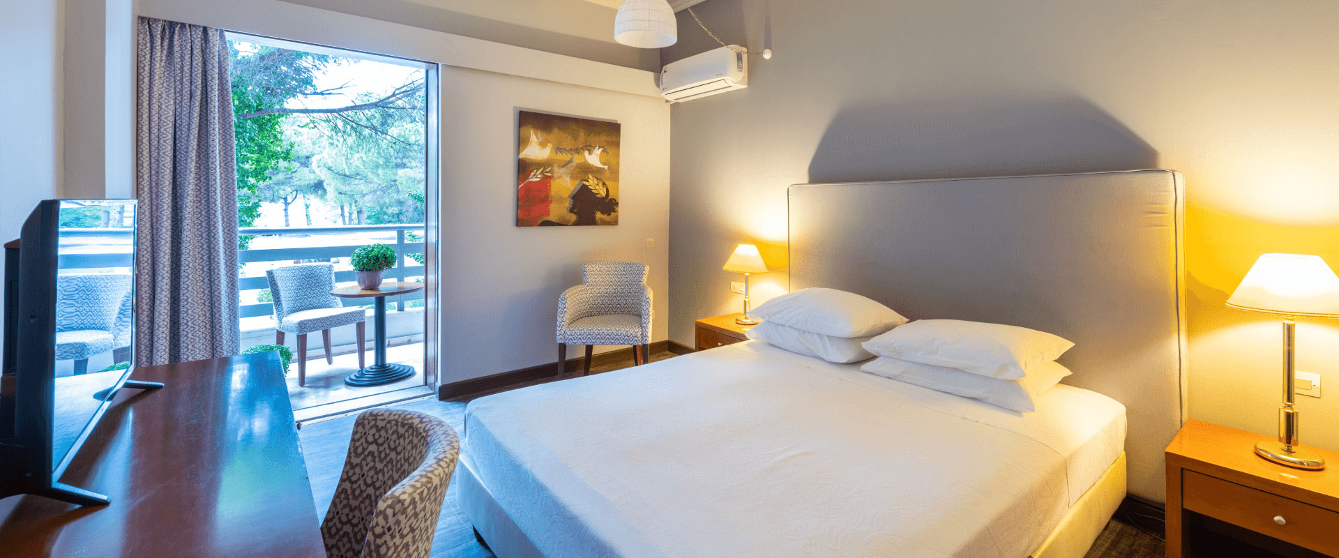 Το Porto Rio Hotel διαθέτει ευρύχωρα δίκλινα δωμάτια με αρμονικούς συνδυασμούς χρωμάτων. Όλα έχουν ιδιωτικό, επιπλωμένο μπαλκόνι με θέα στο βουνό ή τη θάλασσα. Τα διπλά τζάμια στα παράθυρα εξασφαλίζουν ησυχία.